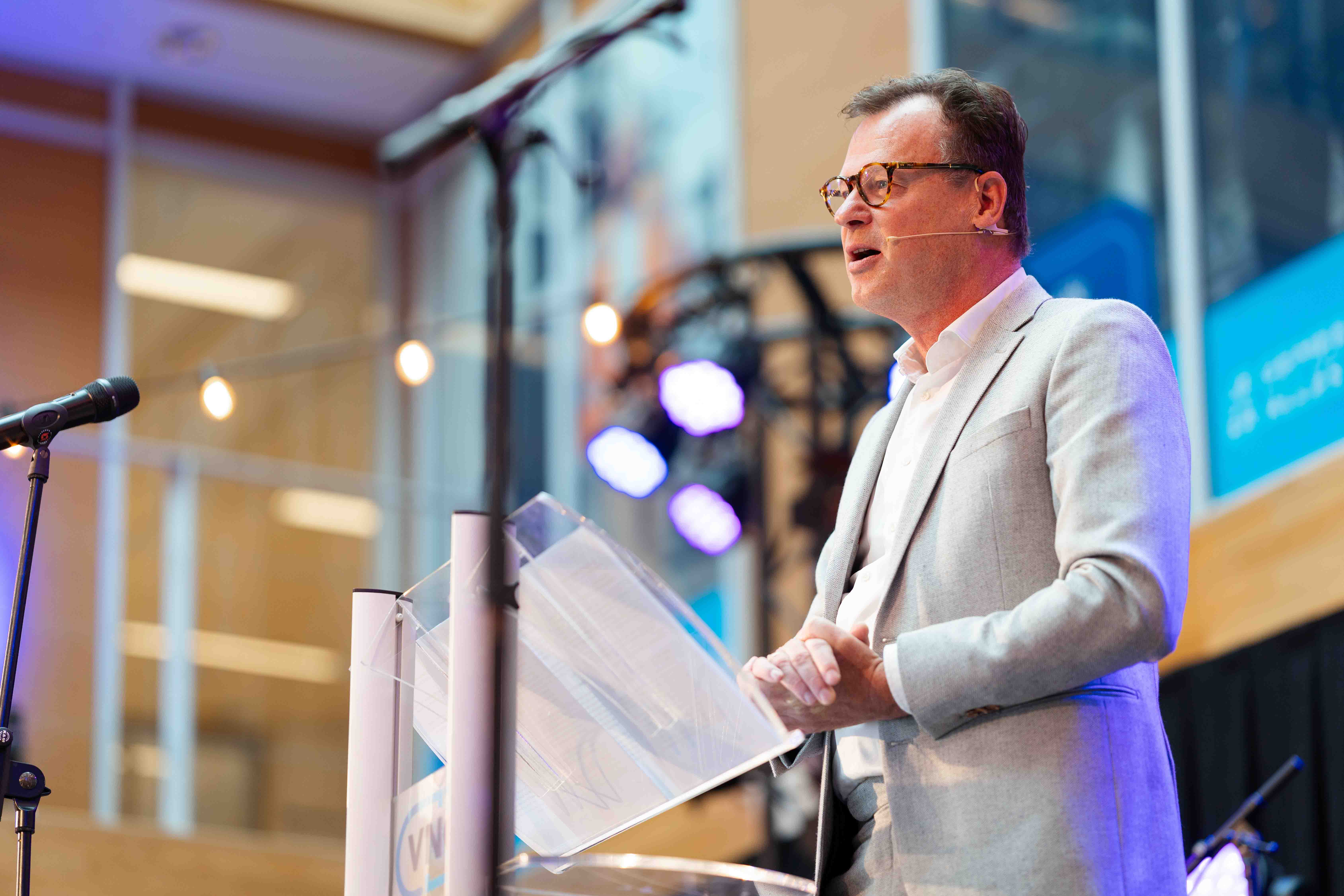 Het atrium bood beperkt ruimte, waardoor het aan ons was om creatief met de indeling om te gaan. Op de tweede verdieping is een trussconstructie geplaatst om het audiosysteem boven het podium te hangen, zodat de vloer vrij bleef voor gasten en veilige looproutes. Met verlichting vanaf de balkons en subtiele kleureffecten kreeg het atrium gedurende de dag een sfeervolle festivaluitstraling, passend bij zowel plenaire momenten als informele ontmoetingen.